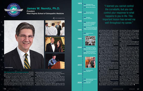 WEST VIRGINIA SCHOOL OF OSTEOPATHIC MEDICINE ’ S ( WVSOM ) seventh president , James Nemitz , Ph . D ., says the responsibilities of his position never end , but he loves representing WVSOM . Nemitz became president of the medical school in 2018 .