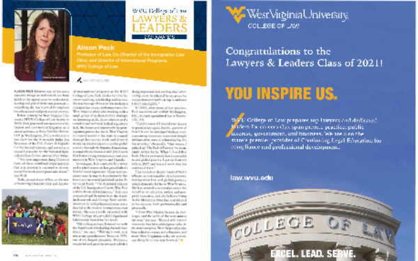 of international programs at the WVU College of Law , Peck divides her time between teaching , scholarship and service . She teaches eager first-year law students a common law course with importance for West Virginia while also working with a small group of dedicated clinic students on lawyering skills , client relations and a complex and technical federal regulatory field . She fosters and supports the burgeoning immigration law bar in West Virginia to expand access in the state to counsel through her service work and directly works on creative ideas to combat global poverty through the Bujuuko Foundation , a nonprofit she founded with Job Kasule that fosters young entrepreneurs and peer mentors in West Virginia and Uganda .