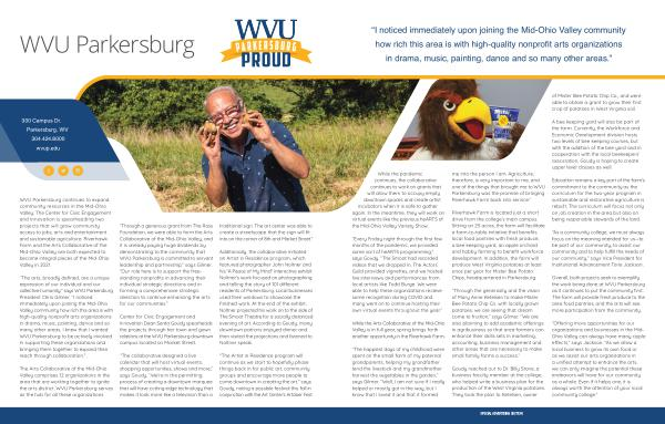 “ Through a generous grant from The Ross Foundation , we were able to form the Arts Collaborative of the Mid-Ohio Valley , and it is already paying huge dividends by demonstrating to the community that WVU Parkersburg is committed to servant leadership and partnership ,” says Gilmer . “ Our role here is to support the freestanding nonprofits in advancing their individual strategic directions and in forming a comprehensive strategic direction to continue enhancing the arts for our communities .”