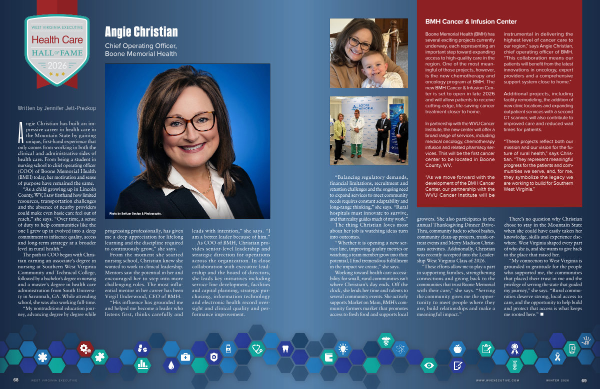 Angie Christian has built an impressive career in health care in the Mountain State by gaining unique, first-hand experience that only comes from working in both the clinical and administrative sides of health care. From being a student in nursing school to chief operating officer( COO) of Boone Memorial Health( BMH) today, her motivation and sense of purpose have remained the same.