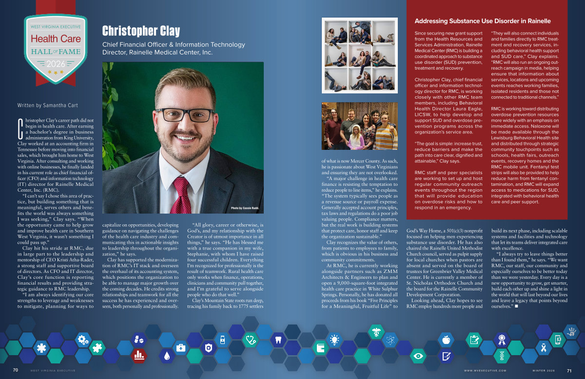 Christopher Clay’ s career path did not begin in health care. After earning a bachelor’ s degree in business administration from King University, Clay worked at an accounting firm in Tennessee before moving into financial sales, which brought him home to West Virginia. After consulting and working with online businesses, he finally landed in his current role as chief financial officer( CFO) and information technology( IT) director for Rainelle Medical Center, Inc.( RMC).