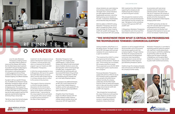 Previously, Modulation Therapeutics worked with partners at WVU to secure STTR funding as well as collaborated with members of the WVU Cancer Institute. Currently, the company collaborates with the WVU Health Sciences Center for testing technologies and is in talks with the cancer institute t o begin clinical trials for its MTI-201 and MTI-301 programs. operations as well as engaged with local service providers such as accountants and insurance agents to aid in the company’ s logistics. Through initiatives like these, the company has become a welcome asset to the Morgantown community, most importantly by providing access to cancer and liver disease patients in West Virginia to groundbreaking therapeutic options.