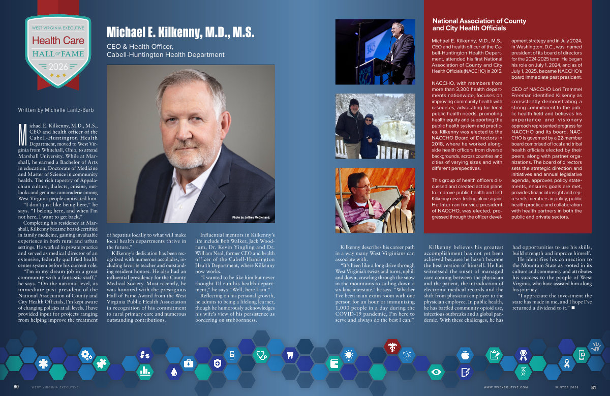 Michael E. Kilkenny, M. D., M. S., CEO and health officer of the Cabell-Huntington Health Department, moved to West Virginia from Whitehall, Ohio, to attend Marshall University. While at Marshall, he earned a Bachelor of Arts in education, Doctorate of Medicine and Master of Science in community health. The rich tapestry of Appalachian culture, dialects, cuisine, outlooks and genuine camaraderie among West Virginia people captivated him.