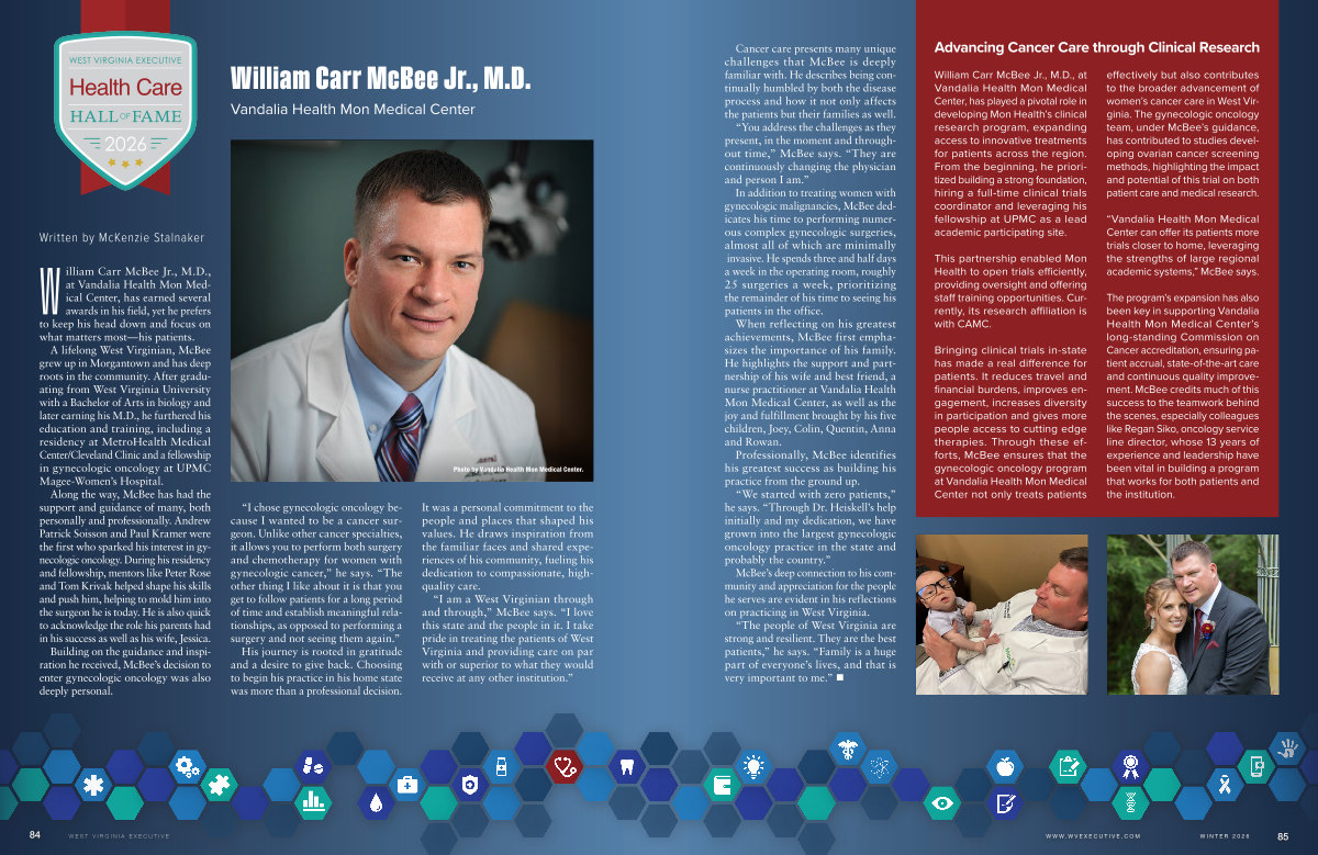 “ I am a West Virginian through and through,” McBee says.“ I love this state and the people in it. I take pride in treating the patients of West Virginia and providing care on par with or superior to what they would receive at any other institution.”