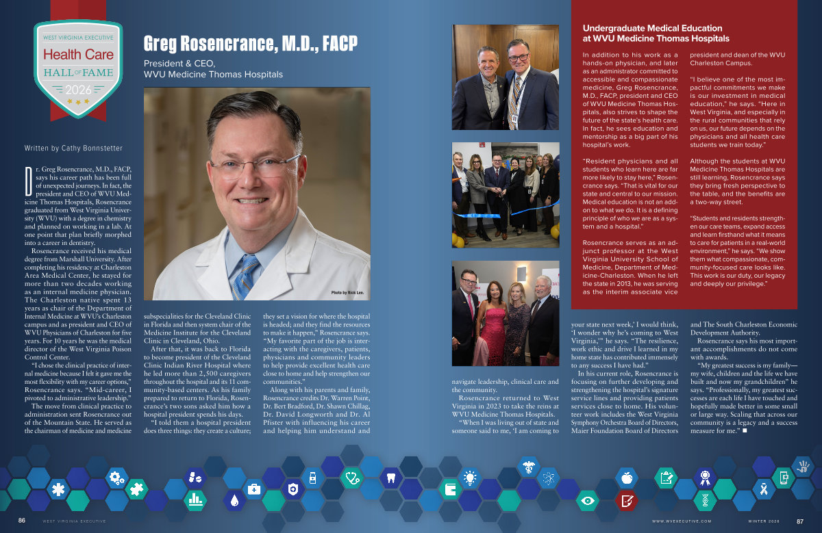 In addition to his work as a hands-on physician, and later as an administrator committed to accessible and compassionate medicine, Greg Rosencrance, M. D., FACP, president and CEO of WVU Medicine Thomas Hospitals, also strives to shape the future of the state’ s health care. In fact, he sees education and mentorship as a big part of his hospital’ s work.