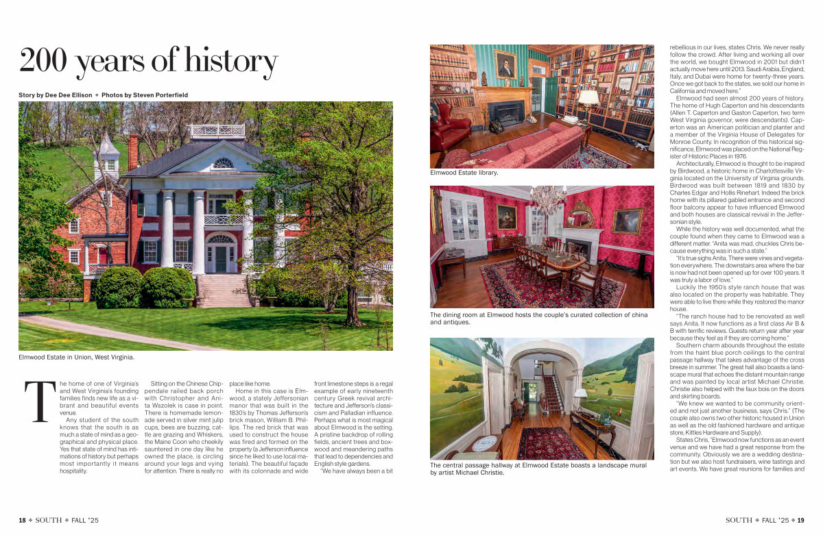 Sitting on the Chinese Chippendale railed back porch with Christopher and Anita Wszolek is case in point. There is homemade lemonade served in silver mint julip cups, bees are buzzing, cattle are grazing and Whiskers, the Maine Coon who cheekily sauntered in one day like he owned the place, is circling around your legs and vying for attention. There is really no |