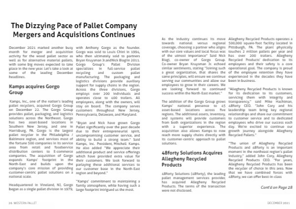December 2021 marked another busy month for merger and acquisition activity for the wood pallet sector as well as for alternative material pallets, with some big moves expected to take place in the new year. Let's take a look at some of the leading December headlines.