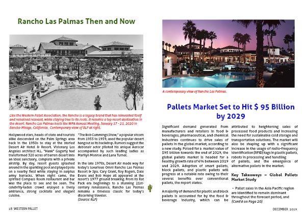 Significant demand generated from manufacturers and retailers in food & beverages, pharmaceutical, and chemical industries continues to drive sales of pallets in the global market, according to a new study. Poised for a market value of $95 billion towards the end of 2029, the global pallets market is headed for a healthy growth rate of 6% between 2019 and 2029. Adoption of smart pallets, block pallets, and plastic pallets will progress at a notable rate owing to their several benefits over conventional pallets, the report states.