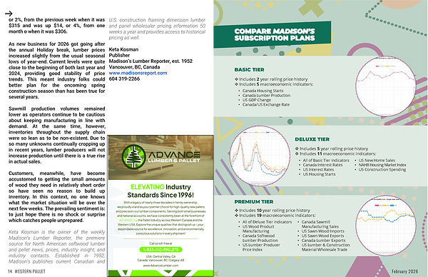 Keta Kosman is the owner of the weekly Madison’s Lumber Reporter, the premiere source for North American softwood lumber and pellet news, prices, industry insight, and industry contacts. Established in 1952, Madison’s publishes current Canadian and U.S. construction framing dimension lumber and panel wholesaler pricing information 50 weeks a year and provides access to historical pricing as well.