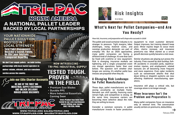 The pallet and wood container industry is no stranger to pressure. Tight margins, labor challenges, rising material costs, and nonstop production demands are part of everyday life. But as 2026 approaches, many pallet companies are facing a different kind of challenge. It's one that can’t be fixed with overtime or new equipment. Risk is changing, insurance markets are tightening, and a single unexpected event can disrupt operations faster than ever before. The question isn’t whether chal- lenges are coming, it’s whether pallet bus- inesses are prepared when they do.
