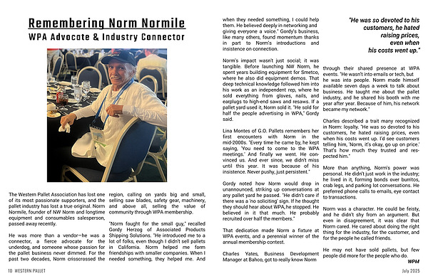 The Western Pallet Association has lost one of its most passionate supporters, and the pallet industry has lost a true original. Norm Normile, founder of NW Norm and longtime equipment and consumables salesperson, passed away recently.
