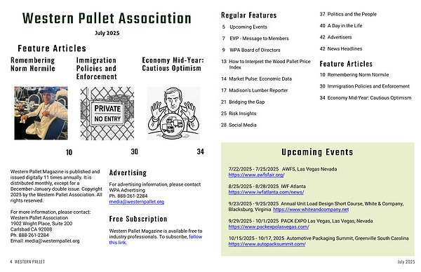 Western Pallet Magazine is published and issued digitally 11 times annually. It is distributed monthly, except for a December-January double issue. Copyright 2025 by the Western Pallet Association. All rights reserved.