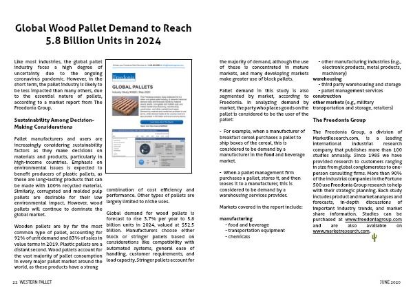 Like most industries, the global pallet industry faces a high degree of uncertainty due to the ongoing coronavirus pandemic. However, in the short term, the pallet industry is likely to be less impacted than many others, due to the essential nature of pallets, according to a market report from The Freedonia Group.