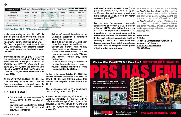 In the week ending October 31, 2025, the price of benchmark softwood lumber item Western Spruce-Pine-Fir 2x4 #2&Btr KD (RL) was US$474 mfbm. This was down $13, or 3%, from the previous week when it was $487, said weekly forest products industry price guide newsletter Madison’s Lumber Reporter.