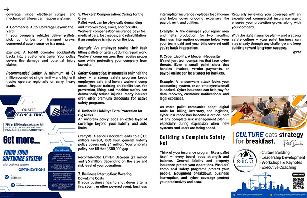Think of your insurance program like a pallet itself — every board adds strength and balance. General liability and property insurance protect your operations. Workers’ comp and safety programs protect your people. Equipment breakdown, business interruption, and cyber coverage protect your productivity and data.