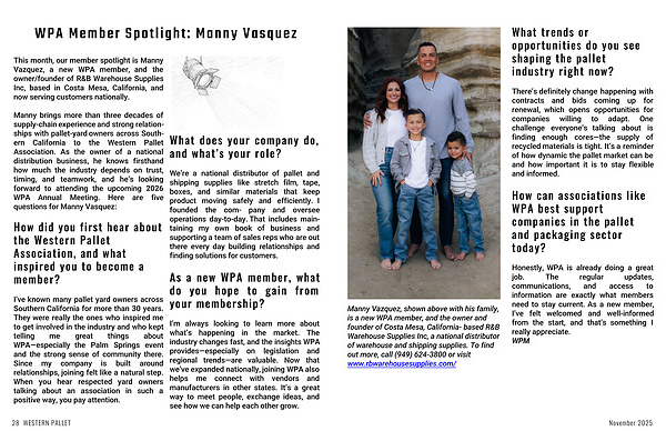 Manny Vazquez, shown above with his family, is a new WPA member, and the owner and founder of Costa Mesa, California- based R&B Warehouse Supplies Inc, a national distributor of warehouse and shipping supplies. To find out more, call (949) 624-3800 or visit www.rbwarehousesupplies.com/