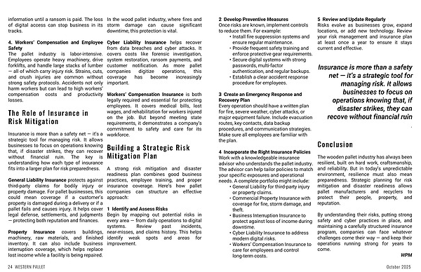 The wooden pallet industry has always been resilient, built on hard work, craftsmanship, and reliability. But in today’s unpredictable environment, resilience must also mean preparedness. Strategic planning for risk mitigation and disaster readiness allows pallet manufacturers and recyclers to protect their people, property, and reputation.