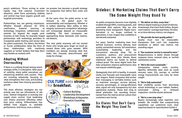 Strategically, that shift is healthy. It rewards clarity over bravado and measurable value over slogans. Pallet companies that anchor their messaging in verifiable metrics such as lead-time averages, on-time delivery, recovery percentages, or energy-efficiency data, signal not only transparency but also operational maturity. Those that cling to dated platitudes risk sounding discon- nected from the metrics-driven culture their customers now live by.
