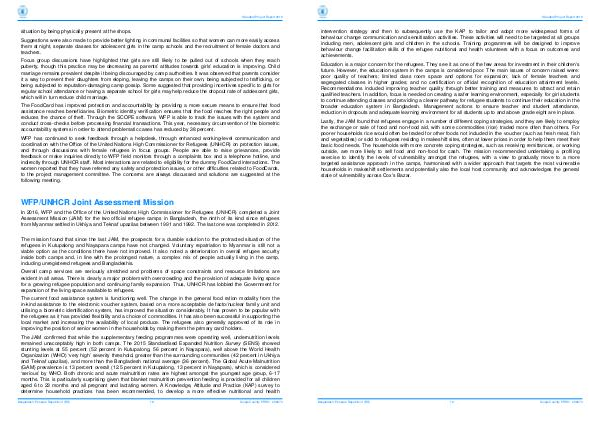 Education is a major concern for the refugees. They see it as one of the few areas for investment in their children’ s future. However, the education system in the camps is considered poor. The main issues of concern raised were: poor quality of teachers; limited class room space and options for expansion; lack of female teachers and segregated classes in higher grades; and no certification or official recognition of education attainment levels. Recommendations included improving teacher quality through better training and measures to attract and retain qualified teachers. In addition, focus is needed on creating a safer learning environment, especially for girl students to continue attending classes and providing a clearer pathway for refugee students to continue their education in the broader education system in Bangladesh. Management actions to ensure teacher and student attendance, reduction in dropouts and adequate learning environment for all students up to and above grade eight are in place.
