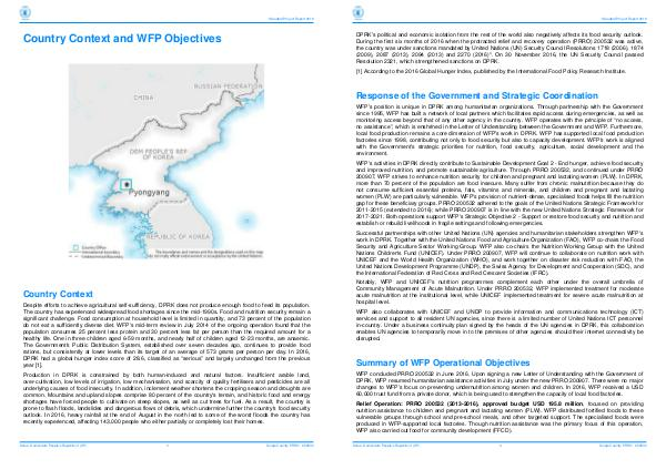 DPRK ' s political and economic isolation from the rest of the world also negatively affects its food security outlook. During the first six months of 2016 when the protracted relief and recovery operation( PRRO) 200532 was active, the country was under sanctions mandated by United Nations( UN) Security Council Resolutions 1718( 2006), 1874( 2009), 2087( 2013), 2094( 2013) and 2270( 2016)*. On 30 November 2016, the UN Security Council passed Resolution 2321, which strengthened sanctions on DPRK.