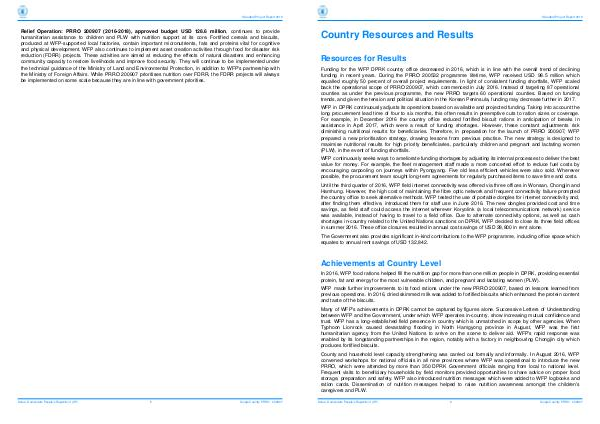 Relief Operation: PRRO 200907( 2016-2018), approved budget USD 128.6 million, continues to provide humanitarian assistance to children and PLW with nutrition support at its core. Fortified cereals and biscuits, produced at WFP-supported local factories, contain important micronutrients, fats and proteins vital for cognitive and physical development. WFP also continues to implement asset creation activities through food for disaster risk reduction( FDRR) projects. These activities are aimed at reducing the effects of natural disasters and enhancing community capacity to restore livelihoods and improve food security. They will continue to be implemented under the technical guidance of the Ministry of Land and Environmental Protection, in addition to WFP ' s partnership with the Ministry of Foreign Affairs. While PRRO 200907 prioritises nutrition over FDRR, the FDRR projects will always be implemented on some scale because they are in line with government priorities.