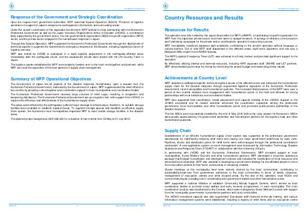 Through this Special Operation, WFP supported the Kumamoto Prefectural Government through the deployment of technical experts to augment the Government ' s emergency response to the disaster, including targeted provision of logistics services.