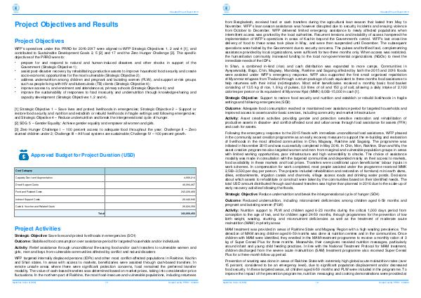WFP targeted internally displaced persons( IDPs) and other most conflict-affected populations in Rakhine, Kachin and Shan states. In areas with access to markets, beneficiaries were assisted through cash-based transfers. In remote unsafe areas where there were significant protection concerns, food remained the preferred transfer modality. The value of cash-based transfers was determined based on market prices, taking into consideration price fluctuations. In the northern part of Rakhine, the most food-insecure and vulnerable populations, including returnees