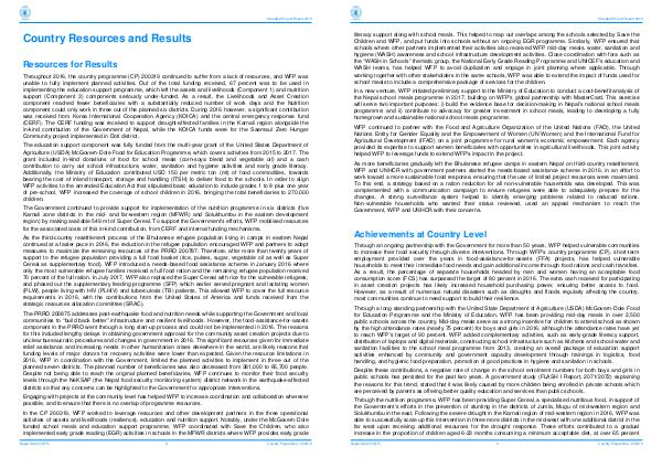 Throughout 2016, the country programme( CP) 200319 continued to suffer from a lack of resources, and WFP was unable to fully implement planned activities. Out of the total funding received, 67 percent was to be used in implementing the education support programme, which left the assets and livelihoods( Component 1) and mutrition support( Component 3) components seriously under-funded. As a result, the Livelihoods and Asset Creation component reached fewer beneficiaries with a substantially reduced number of work days and the Nutrition component could only work in three out of the planned six districts. During 2016 however, a significant contribution was received from Korea International Cooperation Agency( KOICA) and the central emergency response fund( CERF). The CERF funding was received to support drought-affected families in the Karnali region alongside the in-kind contribution of the Government of Nepal, while the KOICA funds were for the Saemaul Zero Hunger Community project implemented in Doti district.
