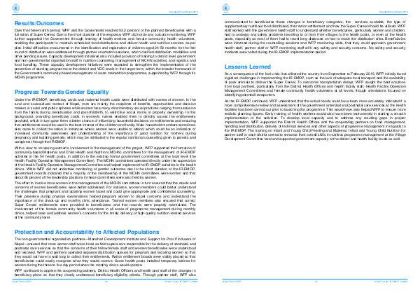 Over the three-month period, WFP and the Government reached 93.2 percent of the planned beneficiaries with a full ration of Super Cereal. Due to the short duration of the response, WFP did not do any outcome monitoring. WFP further supported the Government through training of health workers and female community health volunteers, enabling the participants to maintain scheduled food distributions and deliver health and nutrition services as per plan. Initial difficulties encountered in the identification and registration of children aged 24-59 months for the first round of distribution were addressed through partner orientation sessions, which clarified distribution modalities and other pending issues. Capacity development initiatives also included provision of training to district level government and non-governmental organisation staff in nutrition counseling, management of MCHN activities, and logistics and food handling. These capacity development initiatives were expected to strengthen the implementation of the prevention of stunting programme at the district and VDC levels in the longer term, within the broader framework of the Government ' s community-based management of acute malnutrition programmes, supported by WFP through its MCHN programme.