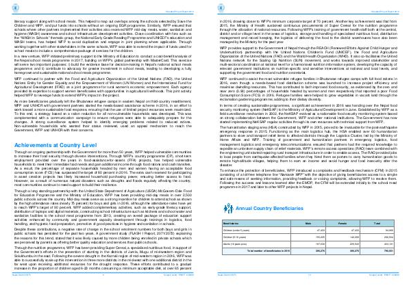 In a new venture, WFP initiated preliminary support to the Ministry of Education to conduct a cost-benefit analysis of the Nepal school meals programme in 2017, building on WFP ' s global partnership with MasterCard. This exercise will serve two important purposes: i) build the evidence base for decision-making in Nepal ' s national school meals programme; and ii) contribute to advocacy for greater investment in school meals, leading to developing a fully homegrown and sustainable national school meals programme.