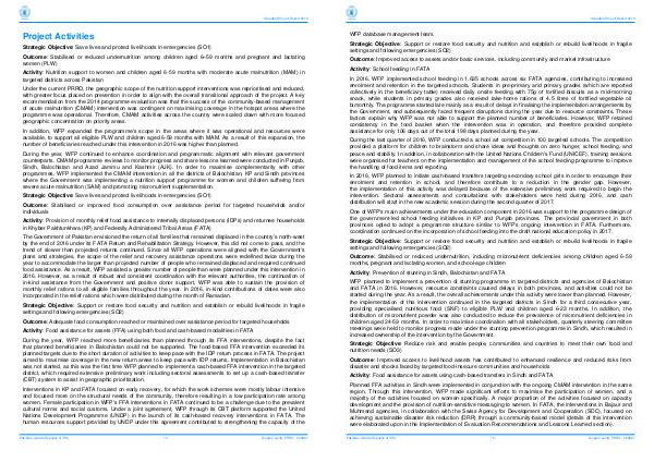 WFP planned to implement a prevention of stunting programme in targeted districts and agencies of Balochistan and FATA in 2016. However, resource constraints caused delays in both provinces, and activities could not be started during the year. As a result, the overall achievements under this activity were lower than planned. However, the implementation of this intervention continued in the targeted districts in Sindh for a third consecutive year, providing specialised nutritious food( SNF) to eligible PLW and children aged 6-23 months. In addition, the distribution of micronutrient powder was also conducted to reduce the prevalence of micronutrient deficiencies in children aged 24-59 months. In order to maximise coordination with all stakeholders, quarterly steering committee meetings were held to monitor progress made under the stunting prevention programme in Sindh, which resulted in increased ownership of the intervention by the Government.
