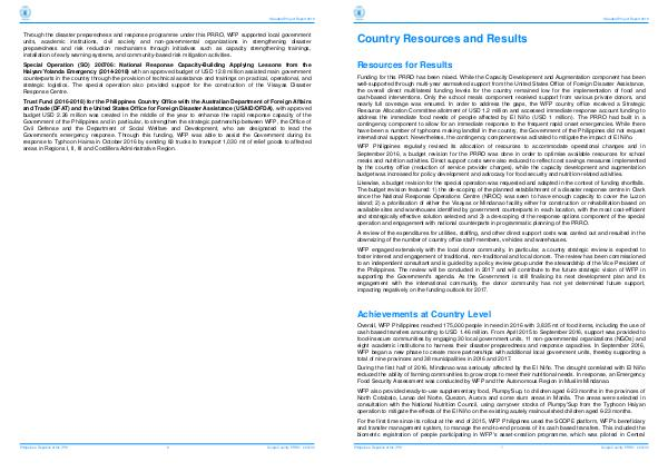 Funding for this PRRO has been mixed. While the Capacity Development and Augmentation component has been well-supported through multi-year earmarked support from the United States Office of Foreign Disaster Assistance, the overall direct multilateral funding levels for the country remained low for the implementation of food and cash-based interventions. Only the school meals component received support from various private donors, and nearly full coverage was ensured. In order to address the gaps, the WFP country office received a Strategic Resource Allocation Committee allotment of USD 1.2 million and accessed immediate response account funding to address the immediate food needs of people affected by El Niño( USD 1 million). The PRRO had built in a contingency component to allow for an immediate response to the frequent rapid onset emergencies. While there have been a number of typhoons making landfall in the country, the Government of the Philippines did not request international support. Nevertheless, the contingency component was activated to mitigate the impact of El Niño.