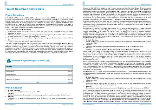 This PRRO complemented special operation 200706, which aimed to enhance the disaster preparedness and response capabilities of the Government. It also supported the ongoing programme of the Government in Central Mindanao to promote peacebuilding, reconstruction, and development in conflict-affected areas. This operation contributed to achieving WFP Strategic Objective 1: save lives and protect livelihoods in emergencies; 2: support or restore food security and nutrition and establish or rebuild livelihoods in fragile settings and following emergencies; 3: reduce risk and enable people, communities and countries to meet their own food and nutrition needs; and to achieving Sustainable Development Goal 1: no poverty, 2: zero hunger, and 17: partnerships for the goals.