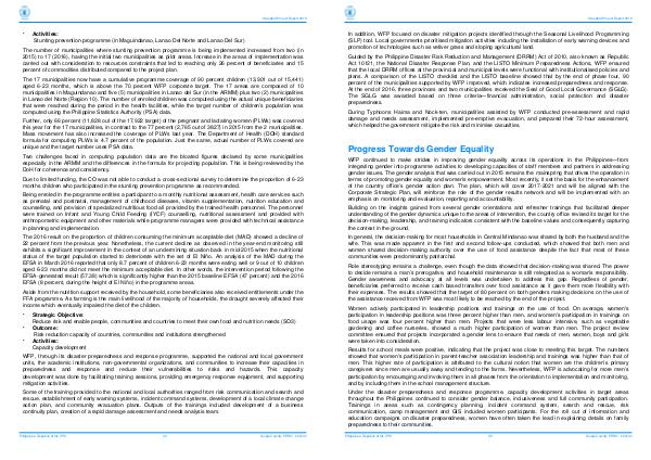 The 2016 result on the proportion of children consuming the minimum acceptable diet( MAD) showed a decline of 22 percent from the previous year. Nonetheless, the current decline as observed in the year-end monitoring still exhibits a significant improvement in the context of an undermining situation back in mid-2015 when the nutritional status of the target population started to deteriorate with the set of El Niño. An analysis of the MAD during the EFSA in March 2016 reported that only 8.7 percent of children 6-23 months were eating well or 9 out of 10 children aged 6-23 months did not meet the minimum acceptable diet. In other words, the intervention period following the EFSA-generated result( 57.38) which is significantly higher than the 2015 baseline EFSA( 47 percent) and the 2016 EFSA( 8 percent, during the height of El Niño) in the programme areas.