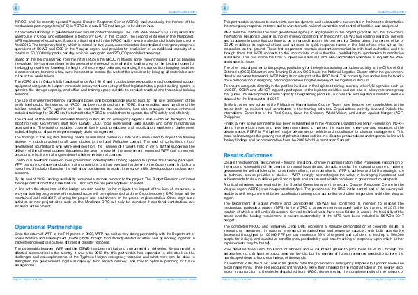 Despite the challenges encountered – funding limitations, change in administration in the Philippines, recognition of the ongoing vulnerability of the country to natural hazards and climactic shocks, the increasing desire of national government for self-sufficiency in humanitarian affairs, the imperative for WFP to achieve and fulfill a strategic role as technical service provider of choice – WFP strongly acknowledges the value in leveraging investment and achievements to date to deliver prioritized outputs and ensure sustainable handover to government counterparts.