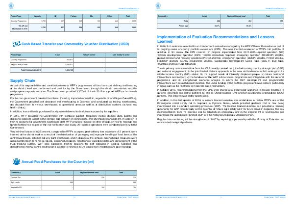 The six primary recommendations from the CPE broadly centred on: i) the forthcoming country strategic plan( CSP) and national engagement; ii) the joint United Nations approach to the new aid landscape in Sri Lanka given its middle income country( MIC) status; iii) the support needs of internally displaced people; iv) future nutritional interventions and support; v) the handover of the WFP school meals programme and integration with the national programme; and vi) strengthened economic analysis to inform the CSP development and programmatic interventions such as cash-based transfers. The under funding of the portfolio( 66 percent) was evident, particularly in areas such as the treatment of moderate acute malnutrition.