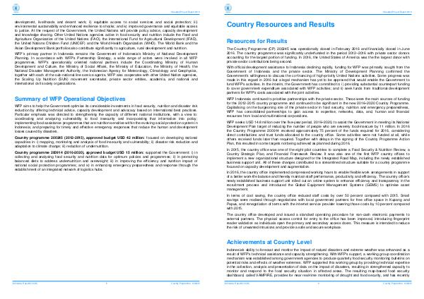 WFP aims to help the Government optimise its considerable investments in food security, nutrition and disaster risk reduction by offering technical advice, capacity development and advocacy based on international best practices. Particular emphasis was directed to strengthening the capacity of different national institutions, with a view to: coordinating and analysing vulnerability to food insecurity and incorporating that information into policy; implementing food assistance programmes that are nutrition-sensitive within the evolving social protection system in Indonesia; and preparing for timely and effective emergency responses that reduce the human and development losses caused by disasters.