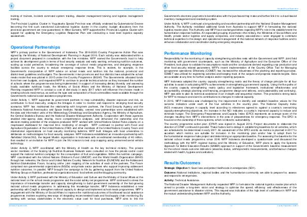 Under Activity 3, WFP partnered with the Ministry of Education and Culture and the Ministry of Social Affairs at the national level on the school meals programme and the social safety net programmes. WFP continued to stress the importance of knowledge transfer and capacity strengthening to build government ownership of the fast-growing national school meals programme. In addressing this knowledge transfer, WFP Indonesia established a new partnership with Cargill to strengthen national capacity to design and implement school meals programmes. WFP’ s engagement with the Ministry of Social Affairs to improve the nutritional outcomes of food-based social assistance programmes involves exploring new ways of integrating recommended foods and food supply chain monitoring. By working with various stakeholders in the electronic value card for food purchases, WFP aims to link the