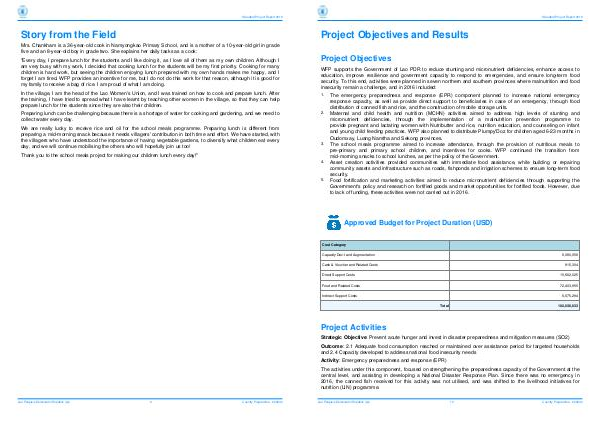 WFP supports the Government of Lao PDR to reduce stunting and micronutrient deficiencies, enhance access to education, improve resilience and government capacity to respond to emergencies, and ensure long-term food security. To this end, activities were planned in seven northern and southern provinces where malnutrition and food insecurity remain a challenge, and in 2016 included: