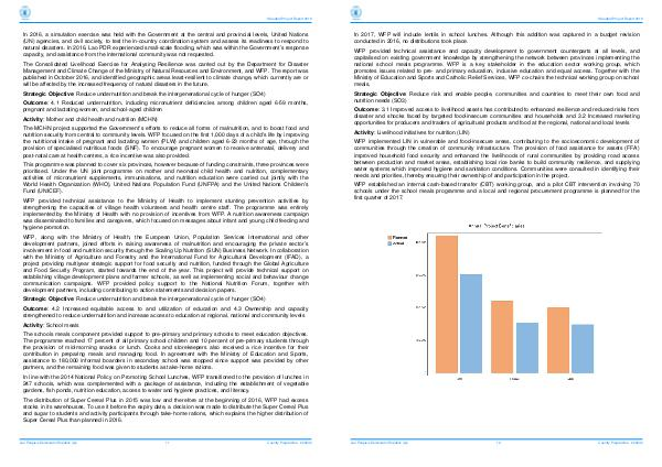 In line with the 2014 National Policy on Promoting School Lunches, WFP transitioned to the provision of lunches in 247 schools, which was complemented with a package of assistance, including the establishment of vegetable gardens, fish ponds, nutrition education, access to water and hygiene practices, and literacy.