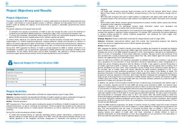 In 2016, a far higher than targeted number of PLW aged 18 or above were provided with nutrition treatment while a lower than targeted number of PLW aged 15-18 years were provided with treatment. This was a result of the project plan being based on incomplete census data. In 2017, the country office will amend targets to reflect the existing demographic breakdowns based on up-to-date data. Around one in three( 36 percent) of PLW that enrolled in the acute malnutrition treatment programme was not able to finish the full course of treatment, which entailed the provision of SNF for a period of six months. As a consequence, only 43 percent of the planned quantity of Timor Vita was actually distributed.