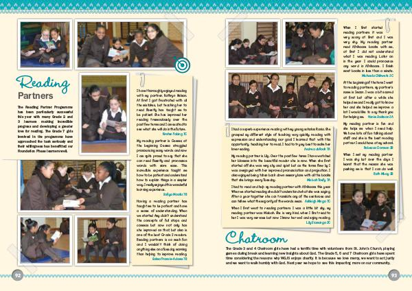The Reading Partner Programme has been particularly successful this year with many Grade 2 and 3 learners making incredible progress and developing a greater love for reading. The Grade 7 girls involved in the programme have approached the task seriously and their willingness has benefitted our Foundation Phase learners well.
