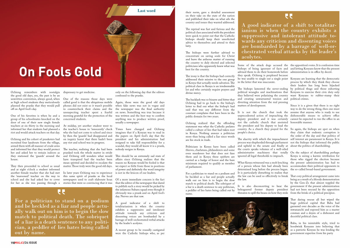 This should be an extremely sad state of affairs since Ochieng realizes that the reason no Kenyan would be fooled is that we expect so little from those in positions of power and definitely the word integrity is not in the lexicon of our leaders.