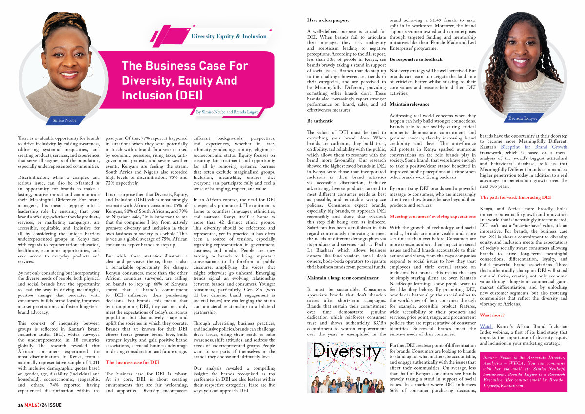 Kenya, and Africa more broadly, holds immense potential for growth and innovation. In a world that is increasingly interconnected, DEI isn’ t just a“ nice-to-have” value, it’ s an imperative. For brands, the business case for DEI is clear: a commitment to diversity, equity, and inclusion meets the expectations of today’ s socially aware consumers allowing brands to drive long-term meaningful connections, differentiation, loyalty, and build powerful brand associations. Those that authentically champion DEI will stand out and thrive, creating not only economic value through long-term commercial gains, market differentiation, and by unlocking new customer segments, but also fostering communities that reflect the diversity and vibrancy of Africans.