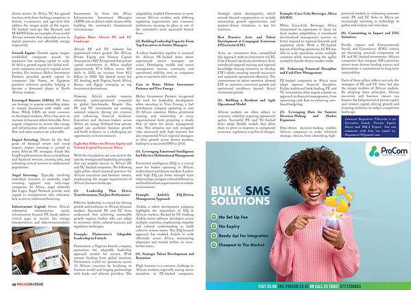 Each of these pillars reflects not only the strategies of PE and VC firms but also the unique realities of African markets. By adopting these principles, African executives and business owners can harness the full potential of private equity and venture capital, driving growth and fostering resilience in today’ s competitive landscape.