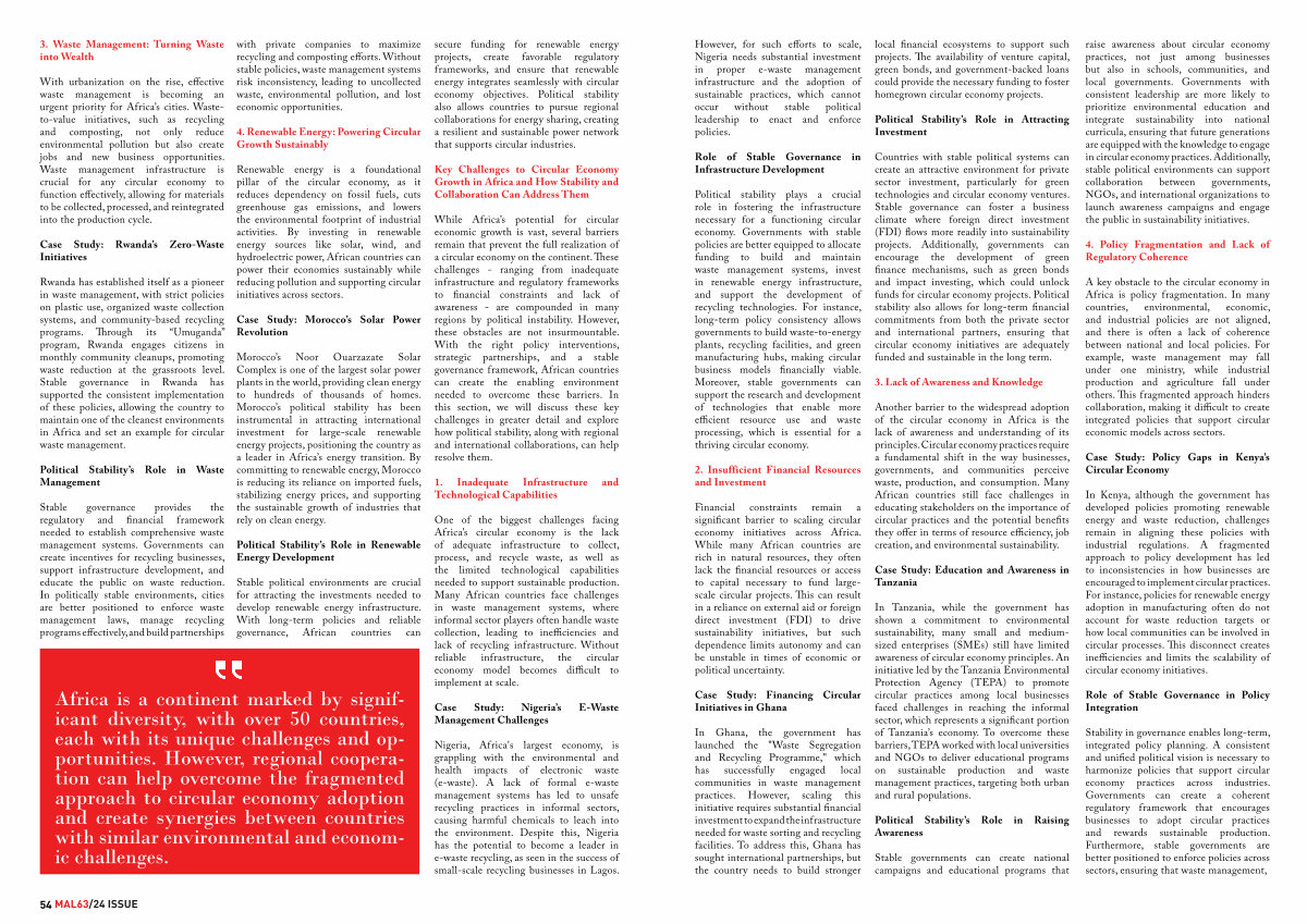 While Africa’ s potential for circular economic growth is vast, several barriers remain that prevent the full realization of a circular economy on the continent. These challenges- ranging from inadequate infrastructure and regulatory frameworks to financial constraints and lack of awareness- are compounded in many regions by political instability. However, these obstacles are not insurmountable. With the right policy interventions, strategic partnerships, and a stable governance framework, African countries can create the enabling environment needed to overcome these barriers. In this section, we will discuss these key challenges in greater detail and explore how political stability, along with regional and international collaborations, can help resolve them.