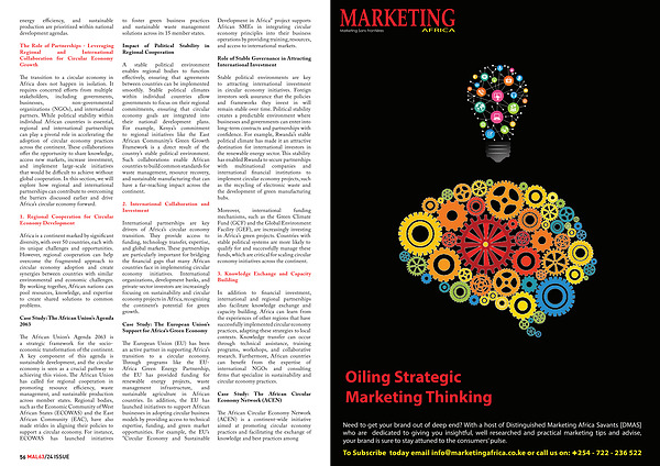 The transition to a circular economy in Africa does not happen in isolation. It requires concerted efforts from multiple stakeholders, including governments, businesses, non-governmental organizations( NGOs), and international partners. While political stability within individual African countries is essential, regional and international partnerships can play a pivotal role in accelerating the adoption of circular economy practices across the continent. These collaborations offer the opportunity to share knowledge, access new markets, increase investment, and implement large-scale initiatives that would be difficult to achieve without global cooperation. In this section, we will explore how regional and international partnerships can contribute to overcoming the barriers discussed earlier and drive Africa’ s circular economy forward.