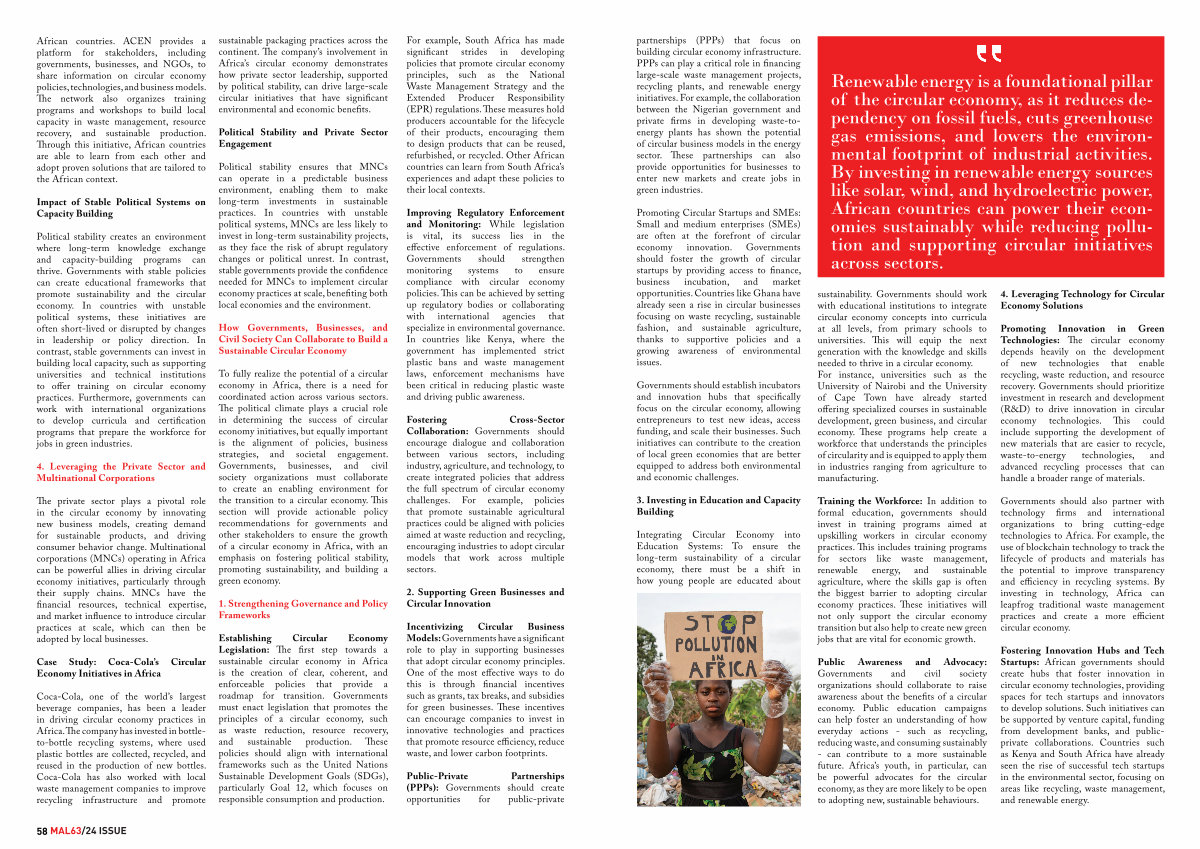 Fostering Innovation Hubs and Tech Startups: African governments should create hubs that foster innovation in circular economy technologies, providing spaces for tech startups and innovators to develop solutions. Such initiatives can be supported by venture capital, funding from development banks, and publicprivate collaborations. Countries such as Kenya and South Africa have already seen the rise of successful tech startups in the environmental sector, focusing on areas like recycling, waste management, and renewable energy.