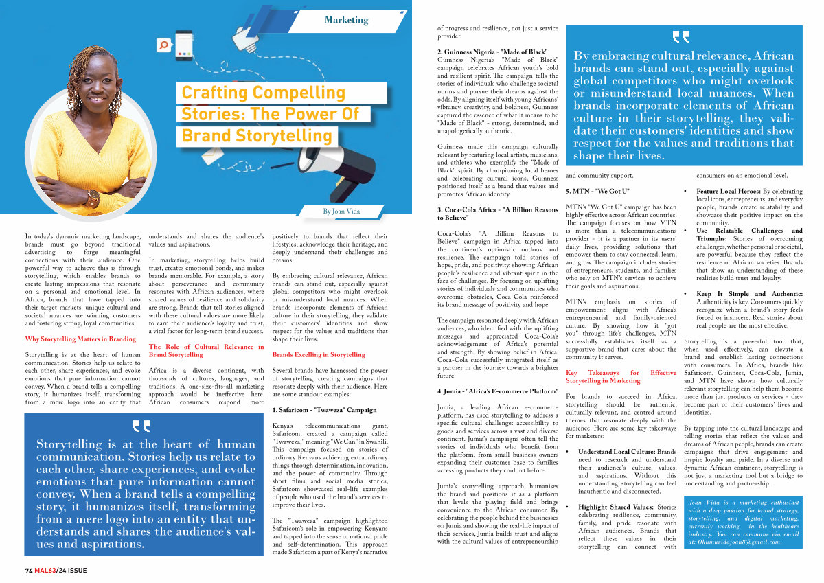 Storytelling is a powerful tool that, when used effectively, can elevate a brand and establish lasting connections with consumers. In Africa, brands like Safaricom, Guinness, Coca-Cola, Jumia, and MTN have shown how culturally relevant storytelling can help them become more than just products or services- they become part of their customers ' lives and identities.