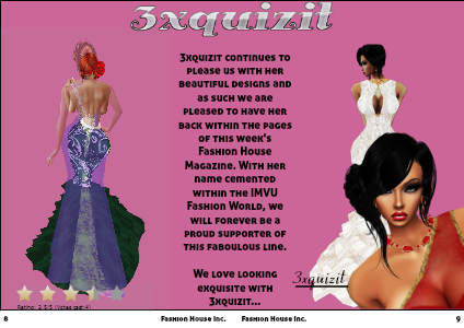 3xquizit continues to please us with her beautiful designs and as such we are pleased to have her back within the pages of this week's Fashion House Magazine. With her name cemented within the IMVU Fashion World, we will forever be a proud supporter of this faboulous line.